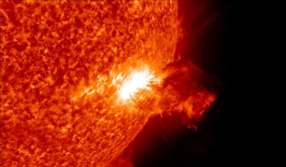 Our own Sun produces flares, but we are protected by our magnetosphere, and by the distance from the Sun to Earth. Credit: NASA/ Solar Dynamics Observatory,[/caption]