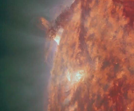 shows two recent events on the Sun: a twisting prominence and the "eclipse" of a plasma eruption by the structure of a darker, cooler filament. Most impressive!
