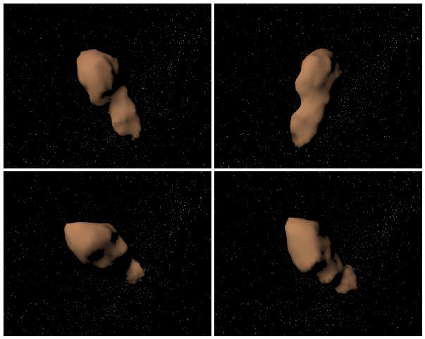 Four computer generated views of Asteroid Toutatis based on Goldstone radar imagery. Via