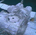 After inspecting some hardware on the P1 Truss for engineers on the ground, the two spacewalkers made their way to the Unity connecting node, where Pettit used Kapton tape to dab away small amounts of grit from a sealing ring on the nadir Common Berthing Mechanism, leaving the CBM in a pristine condition for the attachment of the Raffaello Multi-Purpose Logistics Module during the next shuttle flight to the station in March.