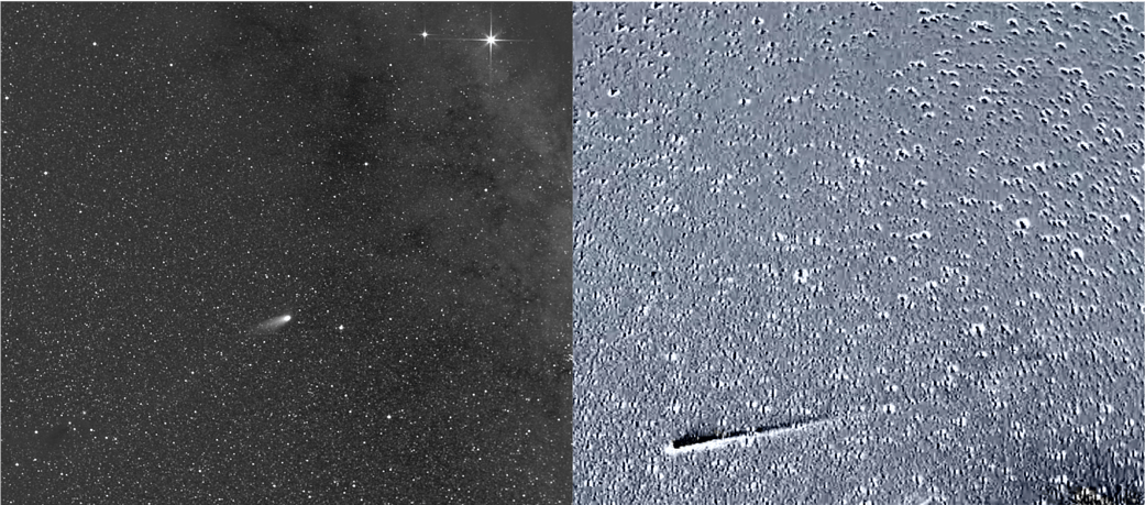 Another animated image was taken by NASA's STEREO-A (Solar Terrestrial Relations Observatory) spacecraft, with its SECCHI/HI-2 telescope. This spacecraft has watched the comet since early November. NASA explained that this animated "difference image" was created by subtracting the current frame from the previous frame to highlight differences between them. Difference images are useful for seeing subtle changes in Leonard's ion tail (the trail of ionized gases streaming from the comet's body, or nucleus), which becomes longer and brighter toward the end of the clip.