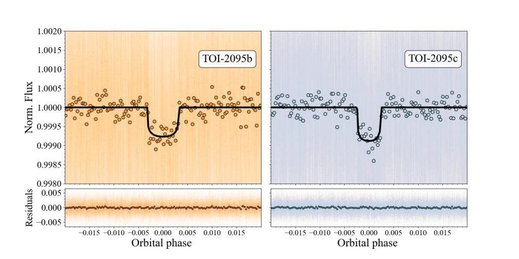 Recently a team has been observing a red dwarf star known as TOI-2095. Its name comes from the fact that it's a TESS Object of Interest, with candidate exoplanets. TOI-2095 is about half the mass of the Sun, but it's only about 140 light-years away. So the team used ground observations to gather further data. Their data confirmed the transits of two planets, TOI-2095b and TOI-2095c.