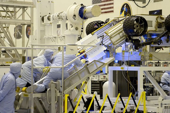 Engineers perform a fit check of the MMRTG on Curiosity at the Kennedy Space Center. The final installation of the MMRTG occurred the evening prior to launch. (Credit: