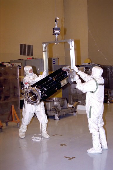 Technicians handle an RTG at the Payload Hazardous Servicing Facility at the Kennedy Space Center for the Cassini spacecraft. (Credit: