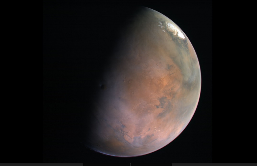 Mars Hope entered a wide-ranging, 55 hour 20,000 by 43,000 kilometer orbit around Mars early last year. Unlike other missions, this vantage point affords the orbiter a full disk view, to study climate and weather variations. To this end, Mars Orbiter is equipped with the Emirates Mars Infrared Spectrometer (EMIRS), the Emirates Mars Ultraviolet Spectrometer (EMUS), and a main multi-band high-resolution camera, the Emirates eXploration Imager (EXI).