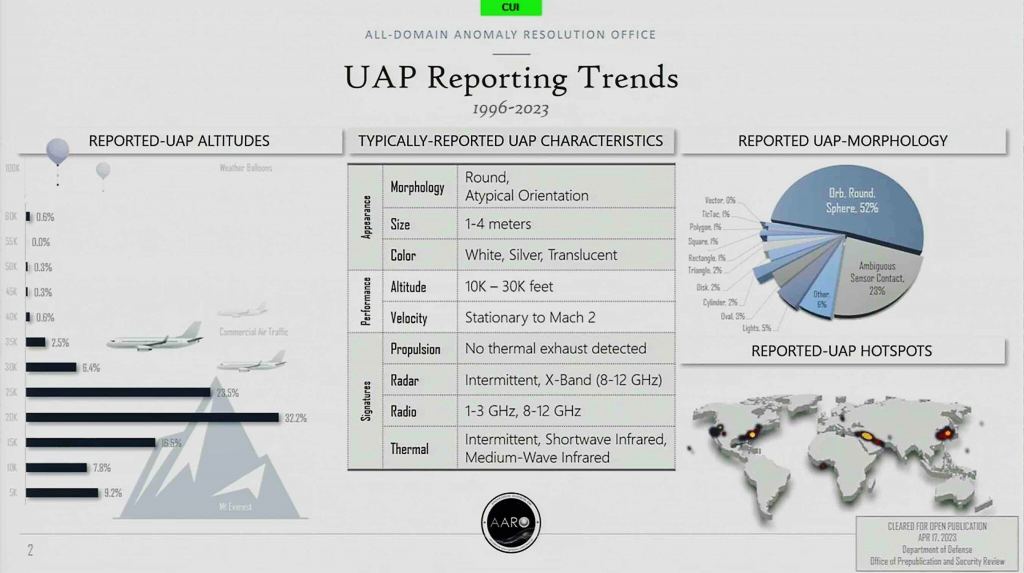 Kirkpatrick said his office has been receiving more and more UAP reports, thanks in part to more open attitudes toward reporting. AARO now has more than 800 cases, with "50 to 100-ish reports" coming in every month, Kirkpatrick said. Most of those cases have eventually been explained, either as natural phenomena or as sightings of artificial objects such as drones or balloons. Kirkpatrick said "2 to 5-ish percent" are still considered anomalous.