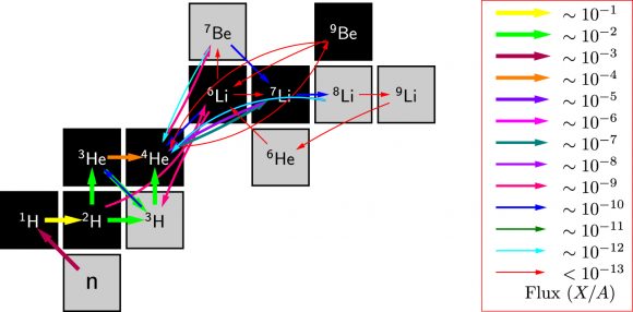 The decay chains of primordial light nuclei in the early days of the Universe. Notice the thin red arrows between Beryllium and Lithium at 10-13, the earliest time shown on this chart. Image: Chou et. al.[/caption]