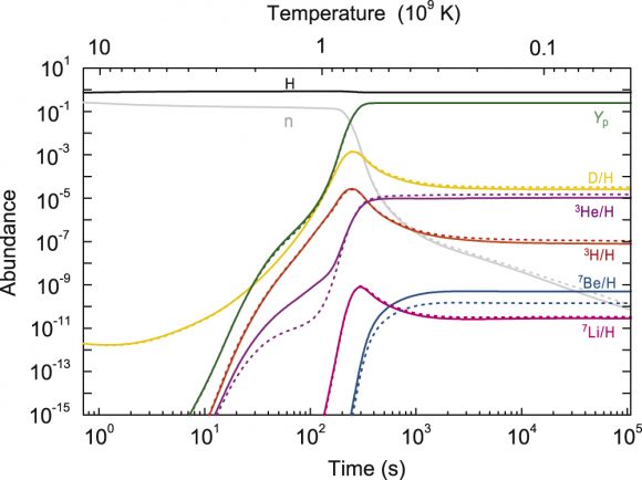 This graphics shows the distribution of early primordial light elements in the Universe by time and temperature. Temperature along the top, time along the bottom, and abundance on the side. Image: Hou et al. 2017[/caption]