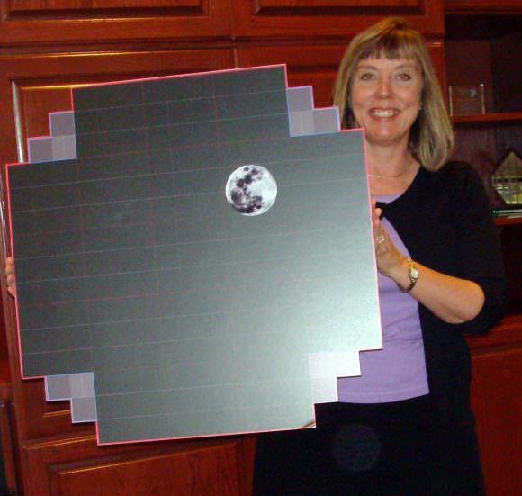 Suzanne Jacoby with the LSST focal plane array scale model. The image of the moon (30 arcminutes) is placed there for scale of the Field of View. Credit: Large Synoptic Survey Telescope (CC-SA 4.0)[/caption]