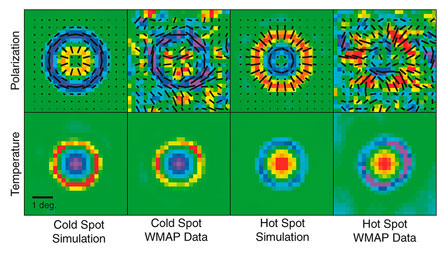 The best eye-candy from the team's six papers are the stacked temperature and polarization maps for hot and cold spots; if these spots are due to sound waves in matter frozen in when radiation (photons) and baryons parted company – the cosmic microwave background (CMB) encodes all the details of this separation – then there should be nicely circular rings, of rather exact sizes, around the spots. Further, the polarization directions should switch from radial to tangential, from the center out (for cold spots; vice versa for hot spots).