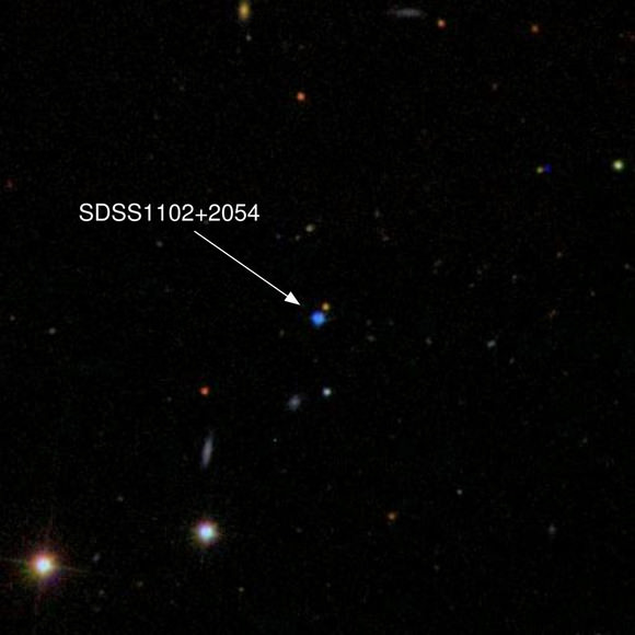 Lead image caption: Sloan Digital Sky Survey spectroscopy of this inconspicuous blue object -- SDSS1102+2054 -- reveals it to be an extremely rare stellar remnant: a white dwarf with an oxygen-rich atmosphere