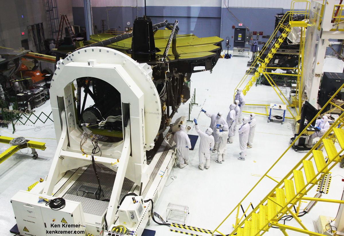 All 18 gold coated primary mirrors of NASA's James Webb Space Telescope are seen fully unveiled after removal of protective covers installed onto the backplane structure, as technicians work inside the massive clean room at NASA's Goddard Space Flight Center in Greenbelt, Maryland on May 3, 2016. The secondary mirror mount booms are folded down into stowed for launch configuration. Credit: Ken Kremer/kenkremer.com[/caption]
