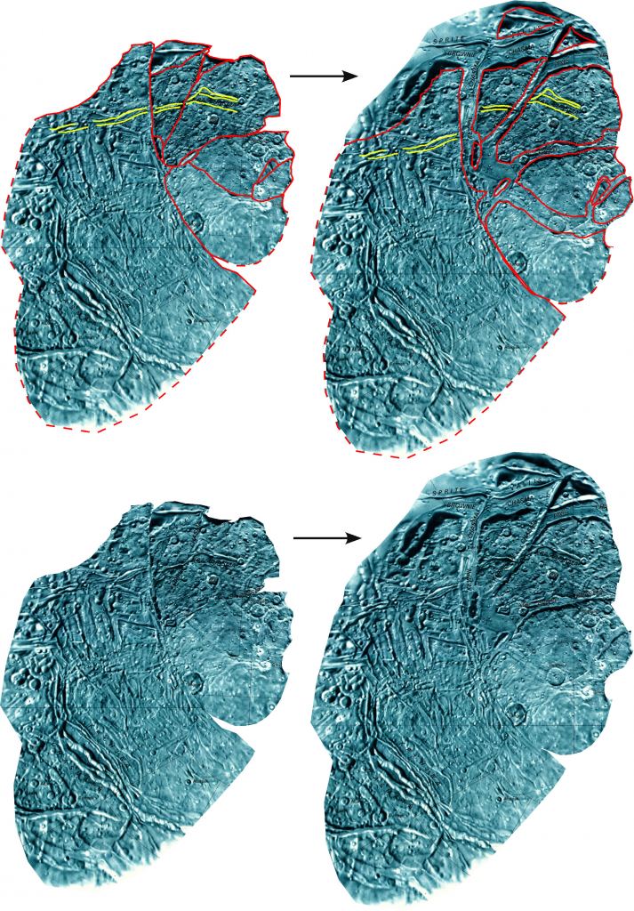 The researchers showed that when they removed the floors of the chasms, the margins lined up. This is strong evidence of spreading. "The margins of Brownie, Kewpie, Korrigan, Pixie, and Sylph Chasmata closely align when the Intermediate Age Smooth Materials (orange unit in Figure 1), which make up the chasma floors, are removed and the Cratered Plains (green unit in Figure 1) are reconstructed," they write.