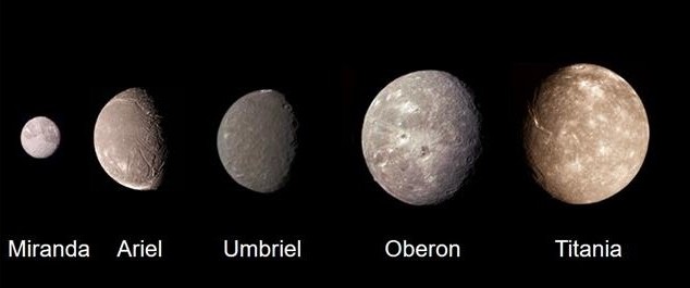 Composite image of Uranus (center) with its five major moons obtained by the NASA Voyager 2 spacecraft (largest to smallest): Ariel, Miranda, Titania, Oberon, and Umbriel. (Credit: NASA/JPL)