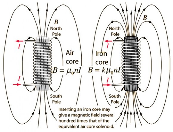 An iron core has the effect of multiplying greatly the magnetic field of a solenoid compared to the air core solenoid on the left. Credit: hyperphysics.phy-astr.gsu.edu