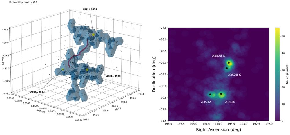 This figure shows the 3D (left) and 2D (right) galaxy overdensity throughout the filament based on the spectroscopic optical data. In the left panel, spectroscopic galaxies and cluster centers are shown as black and yellow large dots respectively. The filament's central spine is shown in red. Identifying the spine is critical to estimating the filament's geometry and length. In the right panel, the black dots show the X-ray cluster centers. Image Credit: Migkas et al. 2025. Astronomy and Astrophysics.