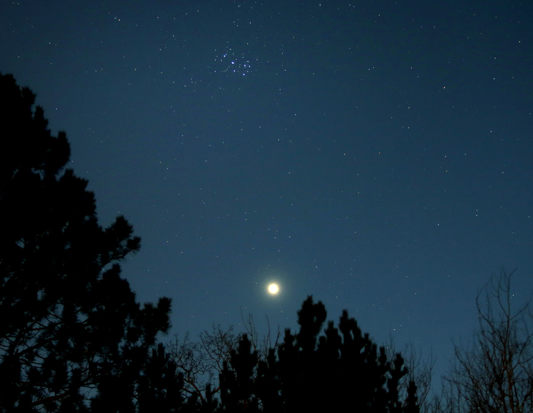 the Pleiades. But each day it snuggles up a little closer until closest approach on Friday. Around that time, you'll be able to view both in the same binocular field. Outrageously bright Venus makes for a stunning contrast against the delicate pinpoint beauty of the star cluster.