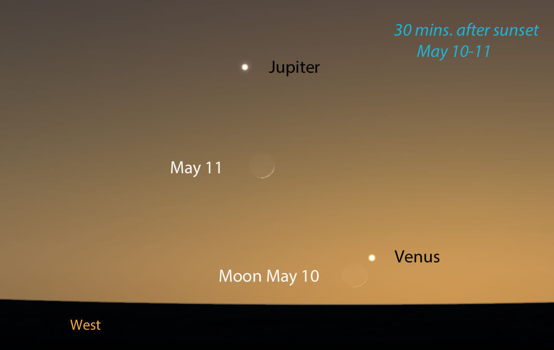 Let's say conditions aren't ideal and you miss the pair on Friday. Well, try again on Saturday. The moon will be higher and much easier to see. Use it as a bow to shoot an imaginary arrow horizon-ward to Venus. And did I mention Jupiter? The planet that cheerily lit up our winter nights is now departing in the west. Watch for it to have a close encounter with Venus on the nights of May 27-28.