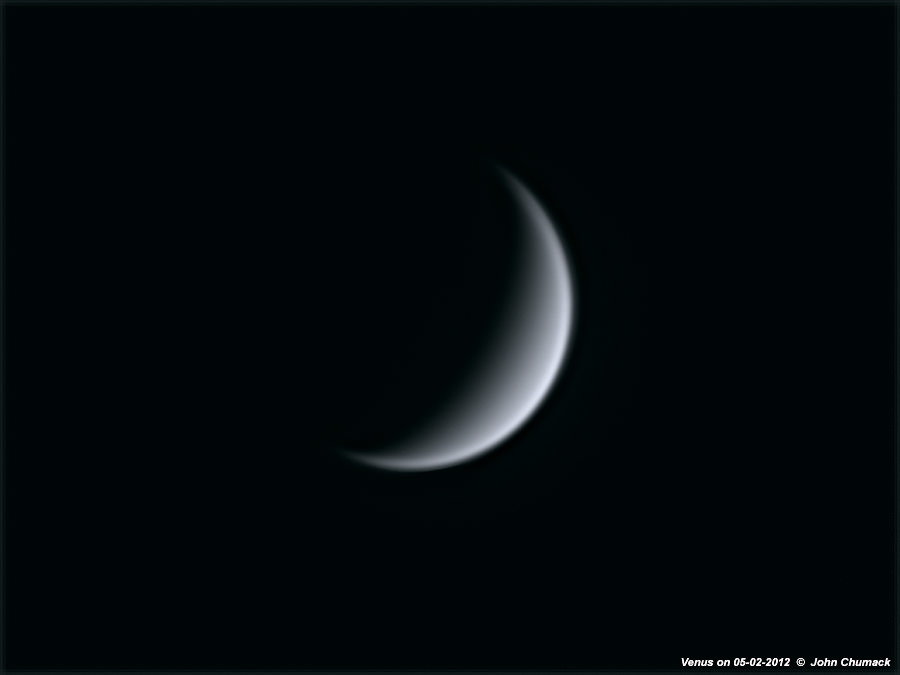 There's a lot of things to know about viewing Venus. Oddly enough, the smaller the phase, the more brightly it shines. If you cannot see its slender form for the glare, simply try wearing sunglasses while using your binoculars... or stacking dark filters, such as green and blue, for the telescope eyepiece. While you'd think that something which sparkles and shines like Venus would be very exciting to see magnified, it's actually pretty bland. However, don't let rather ordinary appearances fool you. Behind that "girl next door" exterior is a really radical chick. Beneath the bland clouds runaway greenhouse gases heat things up to 860 degrees Fahrenheit (460 degrees Celsius) and volcanoes rule.