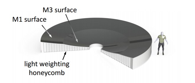 The outer surface forms the primary mirror. It captures light from space first, then that light reflects upwards to the 3.4-meter secondary mirror. After that, it's reflected back down to the inner 5.0-meter surface that forms the tertiary mirror. Then, the light is sent to the camera.