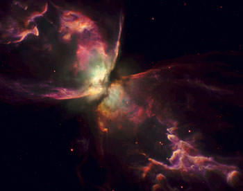 The star at the heart of the Bug Nebula, which lies about 3500 light-years away from Earth in the constellation Scorpius, is what gives the two lobes of the formation their glow. Its extreme temperature of at least 200,000 K (and possibly up to 400,000 K) ionizes the gas in the nebula, which is itself composed of ejecta from the star as it shed its corona during the later stages of its life. The star has gone through its red giant phase and is now a late-stage white dwarf.