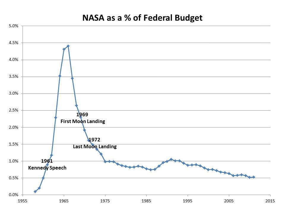 Here's a graph of what NASA's percentage of the budget has been like over time: