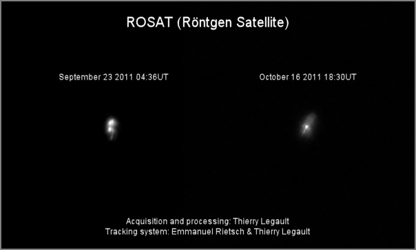 I was waiting for this, and I know our readers have been looking forward to seeing astrophotographer Thierry Legault's images of the ROSAT satellite as it heads towards its uncontrolled re-entry through Earth's atmosphere to its ultimate demise. Legault took a series of images on October 16, 2011 from France and combined them into a video. The speed of the sequences is accelerated 3 times with regard to real time (30 frames per second vs 10 fps). The distance to observer is 275 km, with the altitude of the satellite at 235 km. Angular speed at culmination: 1.66°/s.