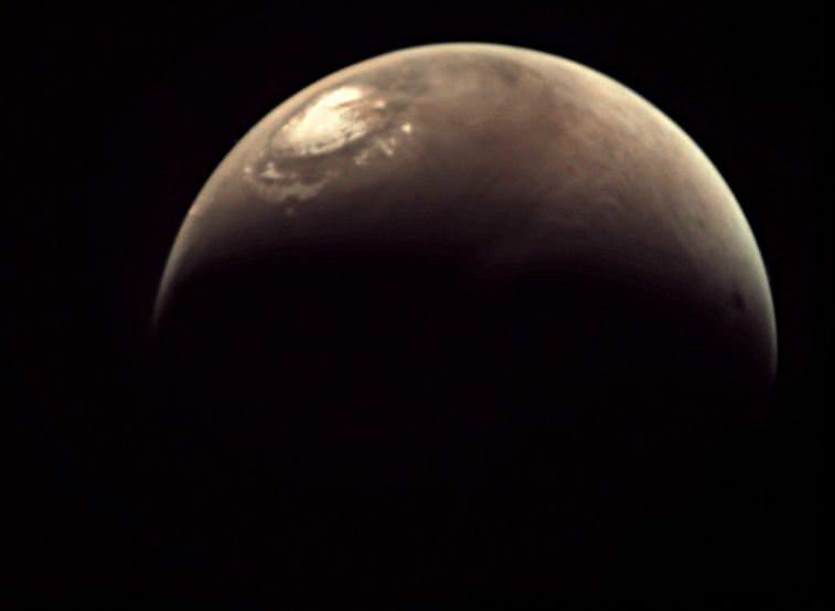 Visible are giant Martian volcanoes, a quick glimpse of the ice-covered South Pole, and Mars terminator as day turns to night. Then quickly daylight returns, and then the visitor sees the North Pole, followed by the long climb away from the planet over the equator. Finally, at the end of the movie -- look closely! --the disk of Phobos can be seen crossing over Mars.
