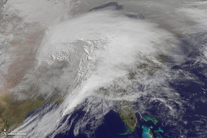 Heavy snow, ice, freezing rain, and frigid wind battered about two thirds of the United States, making it "a winter storm of historic proportions," said the National Weather Service. This animation—made with images from the NOAA-NASA GOES 13 satellite—shows the giant storm developing and moving across the country between January 31 and February 2. Below is another video view from GOES-East satellite, which includes infrared water vapor imagery from January 29 -February 1, 2011.