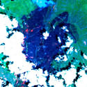 Acquired Sunday morning, June 16, 2002, the Aster image shows active fires in red. The dark blue area is burned vegetation, and the green areas are healthy vegetation. Clouds are white. The blue cloud at the top center is smoke. The image covers an area of 32.2 by 35.2 kilometers (20 by 21.8 miles).