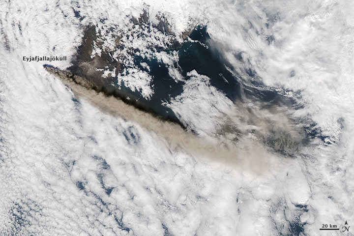 Above is the latest satellite imagery of Eyjafjallajökull, the Iceland volcano, taken on May 12, 2010, taken by the Moderate Resolution Imaging Spectroradiometer (MODIS) on NASA's Aqua satellite. It shows the plume reaching a height of 4 to 5 kilometers (13,000-17,000 feet), even going above the clouds. The plume has switched directions from
