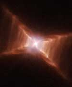 Hubble's sharp pictures show that the Red Rectangle is not really rectangular, but has an overall X-shaped structure, which the astronomers involved in the study interpret as arising from outflows of gas and dust from the star in the center. The outflows are ejected from the star in two opposing directions, producing a shape like two ice-cream cones touching at their tips. Also remarkable are straight features that appear like rungs on a ladder, making the Red Rectangle look similar to a spider web, a shape unlike that of any other known nebula in the sky. These rungs may have arisen in episodes of mass ejection from the star occurring every few hundred years. They could represent a series of nested, expanding structures similar in shape to wine glasses, seen exactly edge-on so that their rims appear as straight lines from our vantage point.