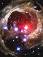 The Hubble telescope has imaged V838 Mon and its light echo several times since the star's outburst in January 2002, in order to follow the constantly changing appearance of the dust as the pulse of illumination continues to expand away from the star at the speed of light. During the outburst event, the normally faint star suddenly brightened, becoming 600,000 times more luminous than our Sun. It was thus one of the brightest stars in the entire Milky Way, until it faded away again in April 2002. The star has some similarities to a class of objects called "novae," which suddenly increase in brightness due to thermonuclear explosions at their surfaces; however, the detailed behavior of V838 Mon, in particular its extremely red color, has been completely different from any previously known nova.