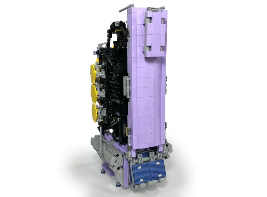 The LEGO replica models JWST's curved primary mirror made up of 18 movable hexagonal segments, as well as its hinged secondary mirror. It also incorporates all of JWST's major subsystems, including the science instruments, and the propulsion, power, and communications subsystems.