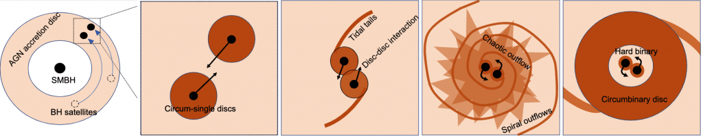 To get to those answers, the team simulated a gas disk with 25 million particles and shaped it as it might exist around the central supermassive black hole in the heart of a quasar. They also inserted two stellar-mass black holes to track their behavior in the disk. They wanted to see if the two objects would get forced into a gravitationally bound binary system. And, what would the forcing mechanisms be? Finally, they wanted to see if the two black holes would eventually merge. It took around 3 months for each simulation to produce an answer.