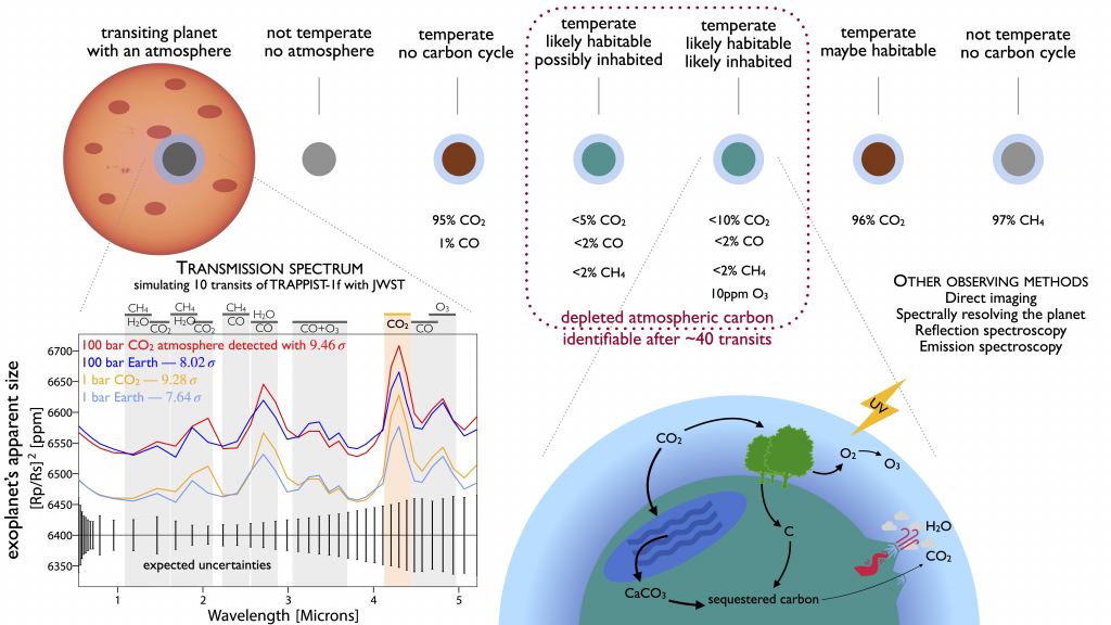 Reference: Triaud, Amaury HMJ, et al. " Atmospheric carbon depletion as a tracer of water oceans and biomass on temperate terrestrial exoplanets. " *arXiv preprint* arXiv:2310.14987 (2023).