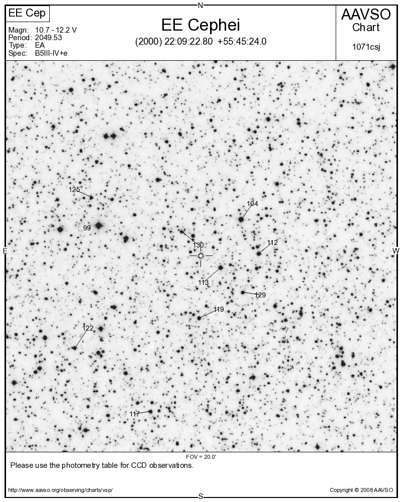 [/caption]The star's name is EE Cephei (RA 22 09 22.76 Dec +55 45 24.2) and and 10.8 magnitude it's well within range of large binoculars and small telescopes. You'll find it located about a degree and a half southwest of 4.2-magnitude Epsilon Cephei (about a finger width held at arm's length). This will get you in the correct approximate field. For smaller optics you'll see far fewer stars than what are depicted on the photographic chart, but the brighter ones will lead the way. However, in larger telescopes you'll easy pick out the star patterns - so use the inset to help guide you to the right star! Now, here's why it's so important...