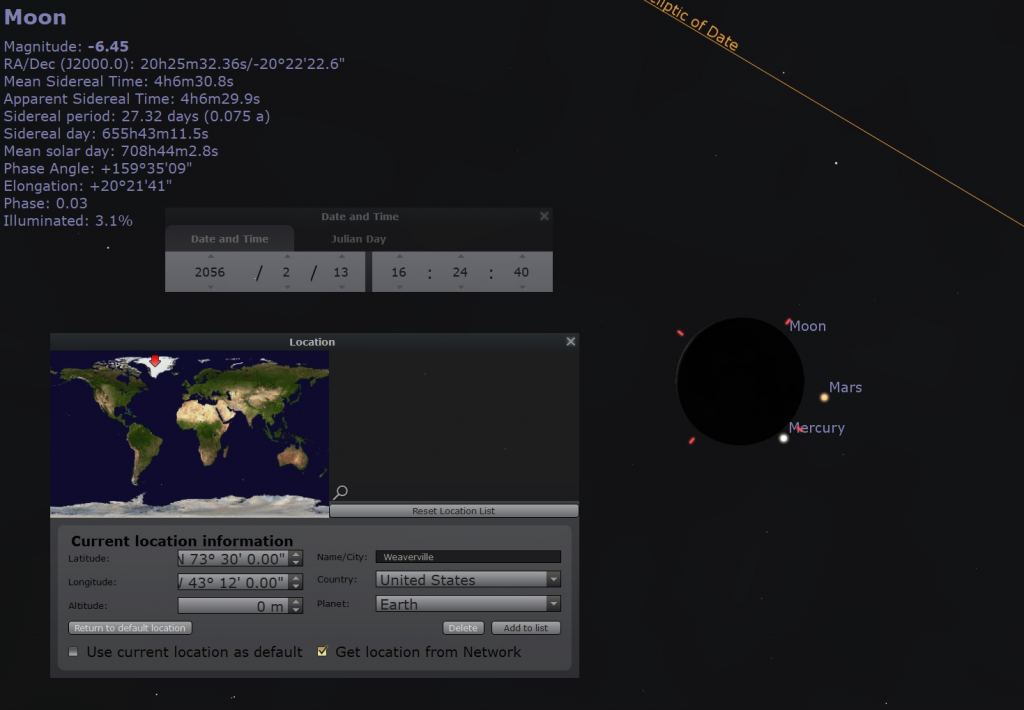The Moon actually occults Mars five times in 2020 … but the February 18thevent is the only favorable event for North America. Here in Norfolk, we have to wait until the night of January 13/14th 2025 to see the Moon occult Mars… just a day prior to opposition. And stick around until April 26th, 2488 AD and head to Antarctica or southern New Zealand, and you can see the Moon occult Mars… during a total lunar eclipse.