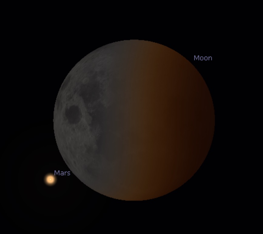 This is the ultimate cosmic photobomb, as our Moon slides in front of Mars in the twilight dawn sky. The bright limb of the Moon is always leading when the Moon is waning, meaning that Mars will disappear behind the illuminated crescent Moon, and reappear along the dark limb.