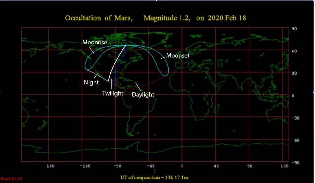 This lunar occultation transpires in the dawn hours of Tuesday February 18thfor North America. Observers in the United States, central Canada and northern Mexico west of a line from the Great Lakes region to the Texas coast of the Gulf of Mexico will see the occultation under dark skies. A sliver of land running from New Orleans to Chicago will see a hybrid event, with ingress occurring before sunrise and egress occurring after, while the U.S. East Coast and the Canadian Maritimes will see the pair close at dawn, but the actual occultation occurring after sunrise.
