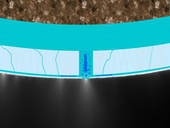 "What is happening is that water comes up and pressure is released," said Matson. "Gases and water come out and the bubbles come near the surface and supply materials to the plumes. Water also transfers laterally, to a great extent, from the point of the plumes. This transfers heat to the surface, by analogy, like the radiator on your car. You have water coming out, which transfers heat to the thin ice layer, and then the heat is radiated to space. Cooled water goes down through cracks in the ice where it gets ready for another trip to the surface. "