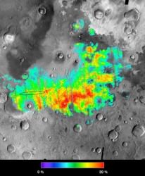 Colors map percentages of hematite in the surface materials in Meridiani Planum on Mars from 5 percent (aqua) to 25 percent (red). Opportunity landed within the black oval. MER scientists say the rocks there had once been drenched in water. Credit: NASA[/caption]