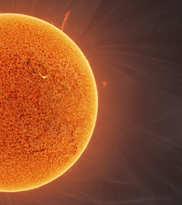 The photosphere is the visible surface of the Sun which we see daily and in astronomical observations. It is approximately 100 kilometers thick, which is miniscule compared to the Sun's diameter, which is approximately 1,400,000 kilometers, and has a temperature range of 3700 to 6200 degrees Celsius. The chromosphere is known as an irregular layer that sits above the photosphere and is approximately 2500 kilometers thick with a temperature range of 6000 to 20,000 degrees Celsius. Solar prominences are the large, bright features that emanate from the Sun, such as the tornado-like feature imaged by McCarthy and have temperature ranges of 4700 to 50,000 degrees Celsius. The solar corona comprises the Sun's outer atmosphere and exhibits the largest temperature at 2 million degrees Celsius. The corona is only visible during solar eclipses, and McCarthy tells *Universe Today* that data from the Solar and Heliospheric Observatory and an image from Guenzel of the 2017 total solar eclipse were combined to form these images.