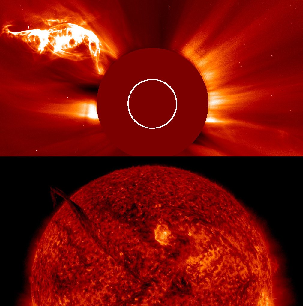 Over the course of April 28–29 a gigantic filament, briefly suspended above the surface* of the Sun, broke off and created an enormous snakelike eruption of plasma that extended millions of miles out into space. The event was both powerful and beautiful, another demonstration of the incredible energy and activity of our home star...and it was all captured on camera by two of our finest Sun-watching spacecraft.