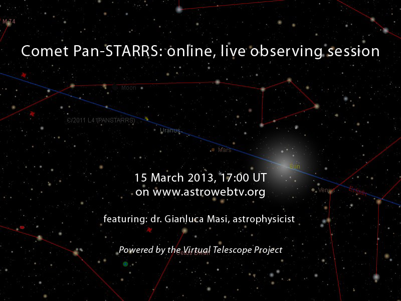 Has it been cloudy where you live and you haven't yet been able to see Comet PANSTARRS? The Virtual Telescope Project will have a live webcast of this comet, C/2011 L4 PANSTARRS, from Italy,