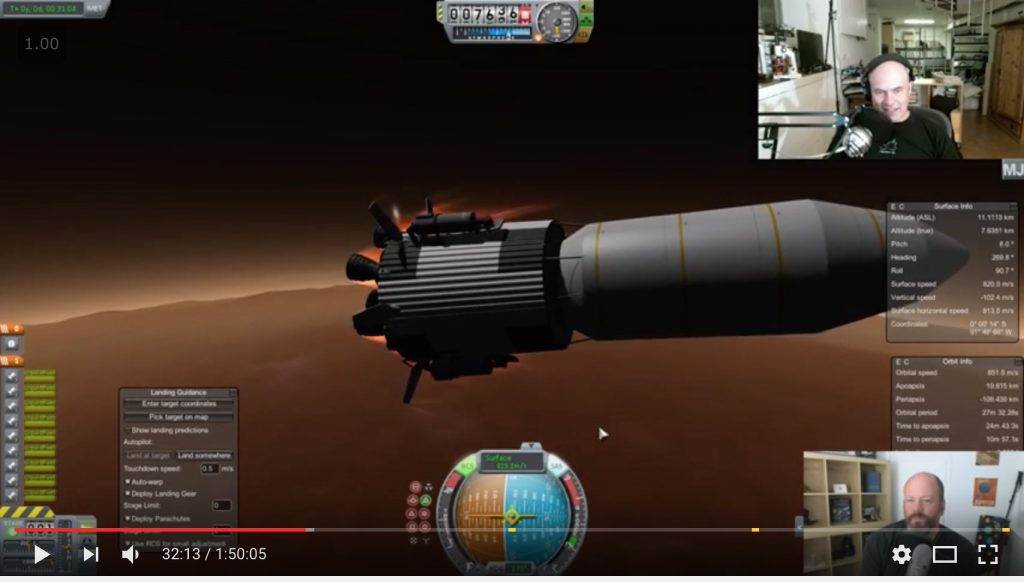 Entering the atmosphere of Duna with 100 Kerbals on board.[/caption] The planets aligned, and Scott was planning to run a livestream game on his Twitch channel Monday night, so I jumped in and provided colour commentary while Scott constructed all aspects of the mission: a spacecraft capable of carrying 100 Kerbals safely to the surface of the Red Planet (Duna), a monster booster rocket to blast the crew compartment into orbit, and a refueling module that travels on a re-purposed booster.