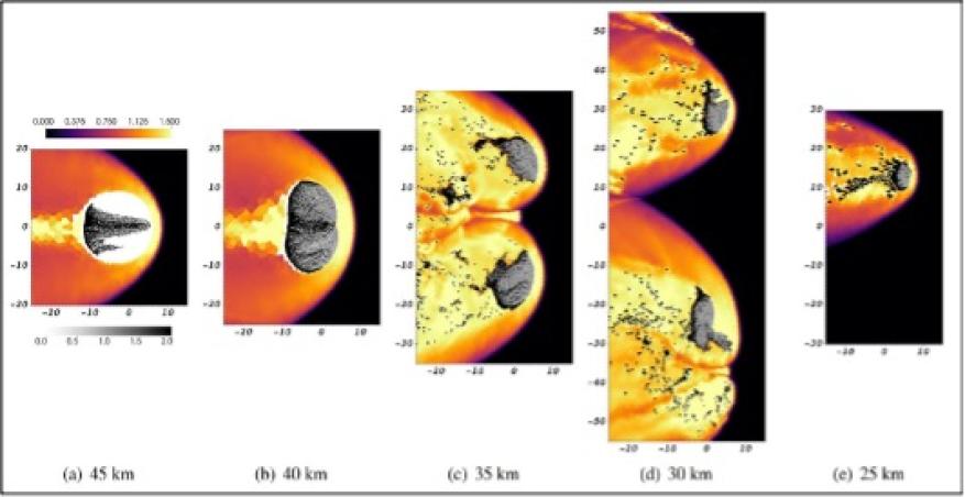To model the impactor and its behavior, the research team used a computational method called "smoothed particle hydrodynamics (SPH)." It models an object in a fluidic flow. In this case, it treats the atmosphere as a fluid. The model also simulates what happens as a Chelyabinsk-sized hunk of rock moves through the simulated air.