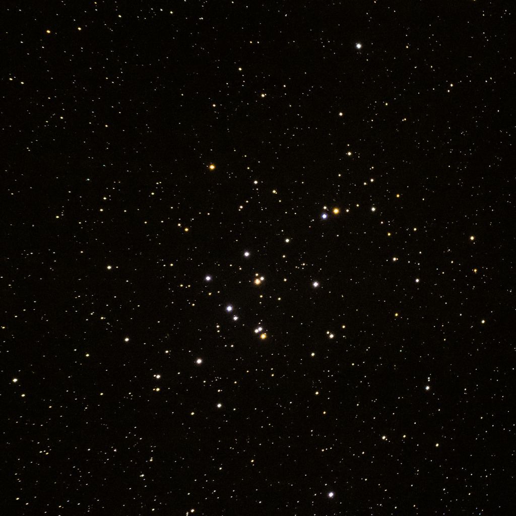 Messier 44, also known as Praesepe or "The Manger" lies at the heart of the astronomical constellation of Cancer, the Crab. M44 is one of the very few open clusters that is visible to the naked eye, and lie along the Moon's path crisscrossing the ecliptic. Located about 577 light years distant, Messier 44 was noted in antiquity as the "Little Cloud" by Hipparchus in the 2ndcentury B.C., and the "Little Mist" by Aratus in the 3rdcentury B.C. Galileo was the first astronomer to note its true nature in 1610, resolving it into dozens of stars with his spyglass telescope. Today, we know that the Beehive hosts in excess of an estimated 1,000 stars.