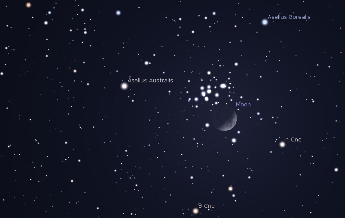 This month's meeting of the Moon versus the Beehive is timed nearly perfectly for North America on Friday evening, May 10that dusk. The Moon is about 38% illuminated, and will occult (pass in front of) several key stars at dusk.