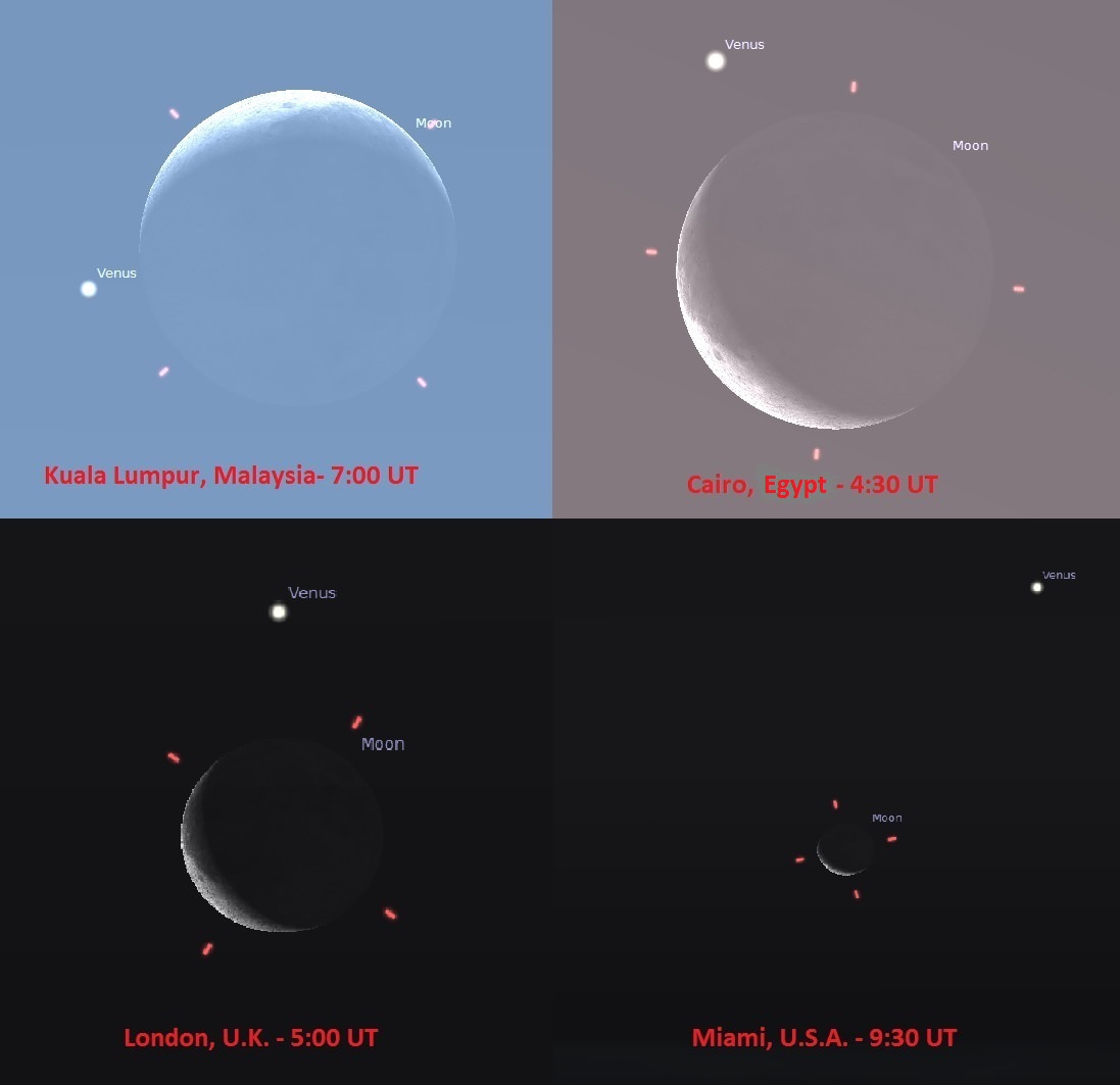 Wednesday's event has a central conjunction time of 5:00 Universal. Viewers in northwestern Africa based in Mali and southern Algeria and surrounding nations will see the occultation occur in the dawn sky before sunrise, while viewers eastward across the Horn of Africa, the southern Arabian peninsula, India and southeast Asia will see the occultation occur in the daylight.